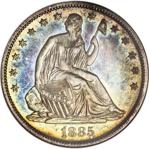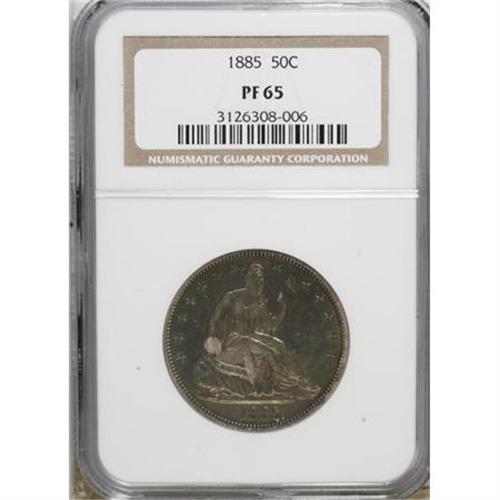 <B>1885 50C PR65 NGC.</B></I> A low total-mintage date from the 1880s with only 6,130 pieces struck, of which 930 were proofs. This is a deeply reflective coin that has lovely toning on each side. The obverse shows deep layers of yellow-gold, rose, sea-green, and violet colors. The reverse, on the other hand, shows even mauve patina with iridescence at the top of that side. Census: 28 in 65, 29 finer (1/08).<BR><BR><B>Coin Engraver:</B> Christian Gobrecht<BR><BR><b>Shipping:</b> Coins & Currency (<a target="_blank" href="http://www.heritageauctions.com/common/shipping.php">view shipping information</a>)