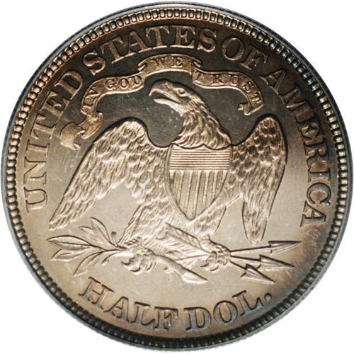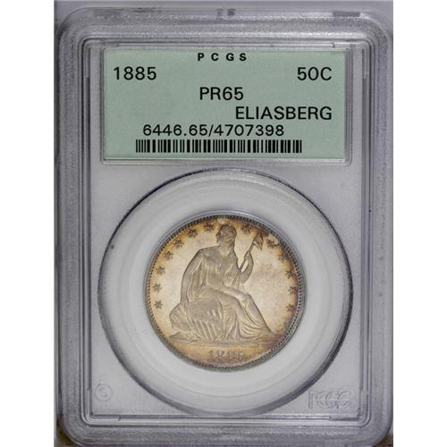 <B>1885<50C> PR65 PCGS.</B></I> Ex: Eliasberg Collection. A low mintage issue from the 1880s, only 930 Proofs were struck of this date as part of a total production of only 6,130 coins. Both sides of this watery Gem are layered in antique-golden, magenta, and hints of electric-blue toning that greatly enhances the eye appeal. Boldly defined throughout and housed in an early PCGS holder with a green insert. Population: 24 in 65, 9 finer (3/06). <BR><BR><B>Important notice:</B> Heritage usually auctions material at the rate of 200-250 lots per hour. On some occasions eBay Live bid software or the Internet may not be able to keep up with the pace of the auction. We recommend placing a realistic absentee bid now as insurance to avoid disappointment. Occasionally the auctioneer may eliminate or reject an eBay Live bid, and the auctioneer may also reopen a lot after the close of the eBay live bidding (usually because we missed an audience bid), and may reject your bid even if it shows you as the winning bidder. By bidding via eBay Live, you agree that Heritage may award the lot to another bidder at its sole discretion under the circumstances described above or any other reasonable circumstances. Since eBay bids are not shown to us until we open the lot on the floor, we treat those bids just like floor bids. In most cases the floor responds before the eBay bid is presented to us, due to Internet lag time, so for consistency we have made it a policy that floor bids are always considered first over tie eBay live bids. Also please note that all Heritage lots purchased through eBay Live carry a 20% Buyer's Premium. Please make sure you read the Terms and Conditions before you bid. This lot is being auctioned in conjunction with a live floor auction by Heritage Galleries & Auctioneers. All final auction and invoice information will be supplied by Heritage Galleries & Auctioneers, and all other information should be considered preliminary. Lot:2037 <BR><BR><B>Winning Notification and Billing:</B> After the FINAL session in this auction is complete, Heritage will send e-mail and snail mail invoices. This process normally takes several days. All final auction and invoice information will be supplied by Heritage Galleries & Auctioneers, and all other information should be considered preliminary. <BR><BR>This auction will be conducted on a live auction floor and over the Internet through eBay Live. If you choose to place an absentee bid, please take a moment to <font color='#0000ff'><u><a href='http://pages.ebay.com/liveauctions/help/before/laabsentee.html'>learn how eBay Live absentee bidding works</a></u></font><font color='#000000'>