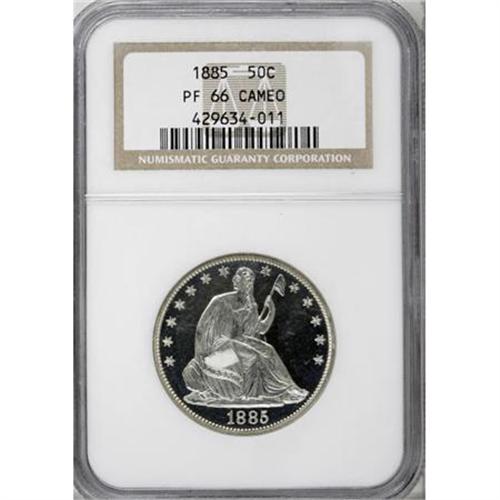 <B>1885 50C PR66 Cameo NGC.</B></I> The 1885 is always a popular date with collectors, as are all the dates from the 1880s, because of the low total mintages from these years. In the case of the 1885 half, only 5,200 business strikes were produced plus another 930 proofs. This is an essentially brilliant proof that shows only the slightest hint of golden color over the denticles. Deeply mirrored in the fields with a significant amount of mint frost over the devices, thus the Cameo designation. Census: 12 in 66, 9 finer (11/07).<BR><BR><b>Shipping:</b> Coins & Currency (<a target="_blank" href="http://www.heritageauctions.com/common/shipping.php">view shipping information</a>)
