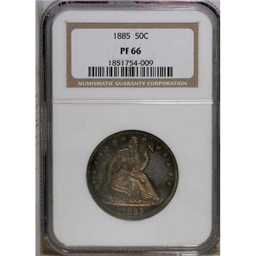 <B>1885 50C PR66 NGC.</B></I> Orange-red, lavender, and gold adorn this suitably mirrored Premium Gem. The strike is exquisite except for trivial incompleteness on Liberty's hair and the left (facing) claw. A low mintage date with a production of 930 proofs and 5,200 business strikes. Census: 21 in 66, 9 finer (10/06).<BR><BR><b>Shipping:</b> Coin/Currency (<a target="_blank" href="http://www.heritageauctions.com/common/shipping.php">view shipping information</a>)