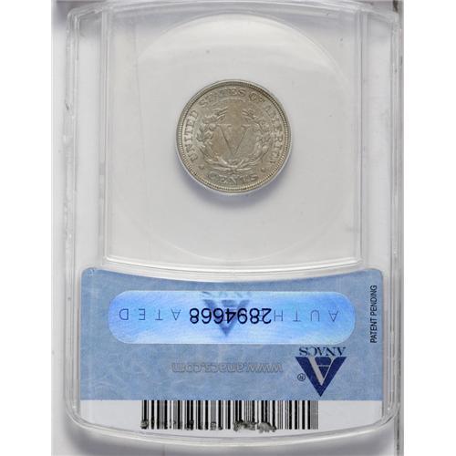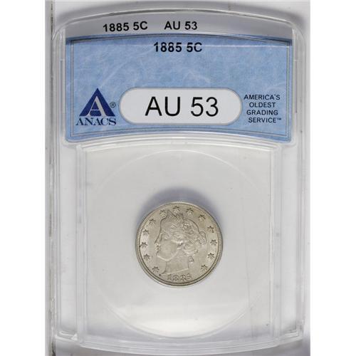 <B>1885 5C AU53 ANACS.</B></I> A well-preserved example of this important key-date example. Lightly worn with significant luster on the surfaces and pleasing rose-orange patina. A pin-point PVC fleck is noted at 7 o'clock on the obverse, and another at 9 o'clock.<BR><BR><b>Shipping:</b> Coin/Currency (<a target="_blank" href="http://www.heritageauctions.com/common/shipping.php">view shipping information</a>)