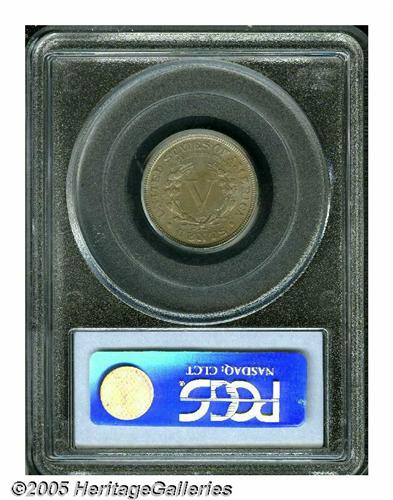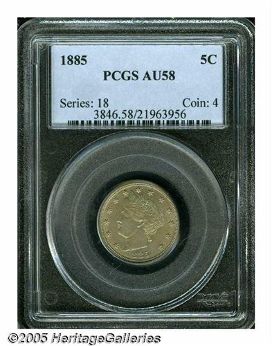 <B>1885<5C> AU58 PCGS.</B></I> The 1885 is the key date Liberty nickel with a high visibility among collectors in other U.S. series. Only 1.5 million pieces were struck for circulation and very few were set aside by collectors in any grade. It is also an issue that is so scarce as a business strike that often collectors substitute the much more available proof strikings in a collection. This specimen is sharply struck, with medium golden-tan patina. The surfaces are remarkably clean.<BR><I>From The Empire State Collection.</B></I>