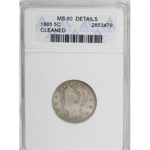 <B>1885 5C --Cleaned--ANACS. MS60 Details.</B></I> The somewhat flat appearance and diffuse luster attest to the noted cleaning, and a tiny hairline scrape is noted from Liberty's chin to the rim at 7 o'clock. The strike is well executed, however, and this key-date coin will become an affordable and still-attractive example for some fortunate collector. Wispy die cracks appear on the lower reverse.<BR><BR><B>Coin Engraver:</B> Charles E. Barber<BR><BR><b>Shipping:</b> Coins & Currency (<a target="_blank" href="http://www.heritageauctions.com/common/shipping.php">view shipping information</a>)