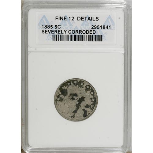 <B>1885 5C --Severely Corroded--ANACS. Fine 12 Details.</B></I> NGC Census: (15/281). PCGS Population (21/353). Mintage: 1,476,490. Numismedia Wsl. Price: $660. (#3846)<BR><BR><b>Shipping:</b> Coins & Currency (<a target="_blank" href="http://www.heritageauctions.com/common/shipping.php">view shipping information</a>)