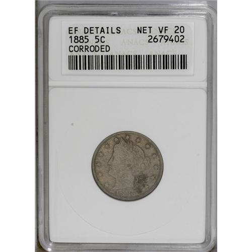<B>1885<5C>--Corroded--ANACS. XF Details, Net VF20.</B></I> Medium gray patina rests over each side. Some light corrosion is seen in the lower right obverse quadrant of this key date. <BR><BR><B>Important notice:</B> Heritage usually auctions material at the rate of 200-250 lots per hour. On some occasions eBay Live bid software or the Internet may not be able to keep up with the pace of the auction. We recommend placing a realistic absentee bid now as insurance to avoid disappointment. Occasionally the auctioneer may eliminate or reject an eBay Live bid, and the auctioneer may also reopen a lot after the close of the eBay live bidding (usually because we missed an audience bid), and may reject your bid even if it shows you as the winning bidder. By bidding via eBay Live, you agree that Heritage may award the lot to another bidder at its sole discretion under the circumstances described above or any other reasonable circumstances. Since eBay bids are not shown to us until we open the lot on the floor, we treat those bids just like floor bids. In most cases the floor responds before the eBay bid is presented to us, due to Internet lag time, so for consistency we have made it a policy that floor bids are always considered first over tie eBay live bids. Also please note that all Heritage lots purchased through eBay Live carry a 20% Buyer's Premium. Please make sure you read the Terms and Conditions before you bid. This lot is being auctioned in conjunction with a live floor auction by Heritage Galleries & Auctioneers. All final auction and invoice information will be supplied by Heritage Galleries & Auctioneers, and all other information should be considered preliminary. Lot:912 <BR><BR><B>Winning Notification and Billing:</B> After the FINAL session in this auction is complete, Heritage will send e-mail and snail mail invoices. This process normally takes several days. All final auction and invoice information will be supplied by Heritage Galleries & Auctioneers, and all other information should be considered preliminary. <BR><BR>This auction will be conducted on a live auction floor and over the Internet through eBay Live. If you choose to place an absentee bid, please take a moment to <font color='#0000ff'><u><a href='http://pages.ebay.com/liveauctions/help/before/laabsentee.html'>learn how eBay Live absentee bidding works</a></u></font><font color='#000000'>