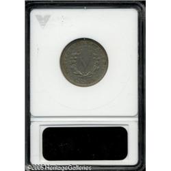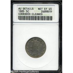 <B>1885 5C --Corroded, Cleaned--ANACS. AU Details, Net XF45.</B></I> Liberty's forehead curl shows moderate wear, but this pearl-gray piece is only faintly cleaned and retains much subdued luster. A subtle spot southeast of the ear is of little relevance. Lot:5876