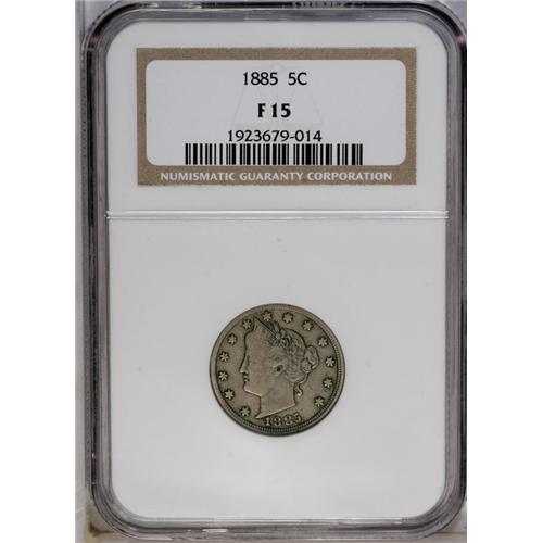 <B>1885<5C> Fine 15 NGC.</B></I> The 1885 is the rarest date of the Liberty Head nickel series available to the average collector. This piece is evenly worn with pearl-gray patina that darkens around the devices.