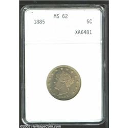 <TR><TD width="100%"><TABLE cellSpacing=1 cellPadding=3 width="100%" border=0><TBODY><TR><TD width="100%" bgColor=#79735c><FONT face=arial color=#ffffff size=3><B>Description</B> </FONT></TD></TR><TR><TD width="100%" bgColor=#ffffff><FONT face=arial size=2><B>1885 5C MS62 ANACS.</B></I> The upper serif of the 1 in the date is lightly recut. A lustrous key date nickel that has a crisp strike and dusky apricot and lavender patina. The peripheries have several lengthy die cracks, as made. The surfaces are surprisingly unabraded. </FONT></TD></TR></TBODY></TABLE></TD></TR></TBODY></TABLE><BR><A name=PricesRealized></A><TABLE cellSpacing=0 cellPadding=0 width="100%" bgColor=#000000 border=0><TBODY><TR><TD width="100%"><TABLE cellSpacing=1 cellPadding=3 width="100%" border=0><TBODY><TR><TD width="100%" bgColor=#79735c><A name=PR><FONT face=arial color=#ffffff size=3><B>Previous Prices from Heritage Auctions</B> </FONT></A></TD></TR><TR><TD bgColor=#f6f6ed><TABLE cellSpacing=0 cellPadding=0 width="100%" border=1><TBODY><TR><TD align=middle width="33%"><B>Date</B></TD><TD align=middle width="33%"><B>Service</B></TD><TD align=middle width="33%"><B>Price</B></TD></TR><TR bgColor=whitesmoke><TD width="33%"><B>01/11/2003</B></TD><TD width="33%">NGC</TD><TD width="33%">$1,150.00</TD></TR></TBODY></TABLE></TD></TR><TR><TD bgColor=#ffffff><FONT face=arial size=1 ?>PLEASE NOTE: All prices realized reflect the final hammer price PLUS the buyer's premium in auctions that charge a buyer's premium. Each item has a notation at the top of the listing indicating whether that lot included a buyer's premium. Example: A item that sells with a final hammer price of $100 and a 20% buyer's premium will display with a price realized of $120. All information listed is intended to be as accurate as possible, but errors are possible. Please use this guide carefully and inform us of any inaccuracies. </FONT></TD></TR></TBODY></TABLE></TD></TR></TBODY></TABLE><BR><TABLE cellSpacing=0 cellPadding=0 width="100%" bgColor=#000000 border=0><TBODY><TR><TD width="100%"><TABLE cellSpacing=1 cellPadding=3 width="100%" border=0><TBODY><TR><TD width="100%" bgColor=#79735c colSpan=6><FONT face=arial color=#ffffff size=3><B>Price Guide*</B> </FONT></TD></TR><TR bgColor=#f6f6ed><TD align=middle><B>Grade</B> </TD><TD align=middle><B>Coin World<BR>(Trends)</B> </TD><TD align=middle><B>Numismedia<BR>Retail</B> </TD><TD align=middle><B>Numismedia<BR>Wholesale</B> </TD><TD align=middle><B>Coin<BR>Universe</B> </TD><TD align=middle><B>Heritage<BR>Value Index</B> </TD></TR><TR bgColor=#ffffff><TD align=middle>61</TD><TD align=right>---</TD><TD align=right>$990.00</TD><TD align=right>$825.00</TD><TD align=right>---</TD><TD align=right>$819.17</TD></TR><TR style="FONT-WEIGHT: bold" bgColor=#cccfdd><TD align=middle>62</TD><TD align=right>$1,300.00</TD><TD align=right>---</TD><TD align=right>$865.00</TD><TD align=right>---</TD><TD align=right>$865.83</TD></TR><TR bgColor=#ffffff><TD align=middle>63</TD><TD align=right>$1,500.00</TD><TD align=right>---</TD><TD align=right>$995.00</TD><TD align=right>$1,275.00</TD><TD align=right>$966.88</TD></TR><TR bgColor=#ffffff><TD colSpan=6><FONT size=1>*All information listed is intended to be as accurate as possible, but errors are possible. No item may be returned or refused based on this information which is provided as a service to our customers. You should contact each pricing source directly to determine the accuracy of this information. </FONT></TD></TR></TBODY></TABLE></TD></TR></TBODY></TABLE><BR><TABLE cellSpacing=0 cellPadding=0 width="100%" bgColor=#000000 border=0><TBODY><TR><TD width="100%"><TABLE cellSpacing=1 cellPadding=3 width="100%" border=0><TBODY><TR><TD width="100%" bgColor=#79735c><FONT face=arial color=#ffffff size=3><B>Population Guide</B> </FONT></TD></TR><TR bgColor=#ffffff><TD align=middle><!-- Begin Output of Population Grid--><TABLE cellSpacing=0 cellPadding=0 width="100%" border=0><TBODY><TR><TD vAlign=center><TABLE cellSpacing=0 width="100%" border=1 cellsadding="3"><TBODY><TR><TD vAlign=center><TABLE cellSpacing=0 cellPadding=3 width="100%" border=1><TBODY><TR><TD vAlign=center align=middle bgColor=#f0f1e8 colSpan=2 <CENTER><FONT face=Arial size=2><B>PCGS Pop </B></FONT><CENTER></CENTER></TD><TD vAlign=center align=middle bgColor=#f0f1e8 colSpan=2><CENTER><FONT face=Arial size=2><B>NGC Pop</B></CENTER></FONT></TD></TR><TR><TD vAlign=center><FONT face=Arial size=2>(62)</FONT> </TD><TD vAlign=center align=right><FONT face=Arial size=2>23</FONT> </TD><TD vAlign=center><FONT face=Arial size=2>(62)</FONT> </TD><TD vAlign=center align=right><FONT face=Arial size=2>11</FONT> </TD></TR><TR><TD vAlign=center><FONT face=Arial size=2>(>62)</FONT> </TD><TD vAlign=center align=right><FONT face=Arial size=2>143</FONT> </TD><TD vAlign=center><FONT face=Arial size=2>(>62)</FONT> </TD><TD vAlign=center align=right><FONT face=Arial size=2>97</FONT> </TD></TR></TBODY></TABLE></TD></TR></TBODY></TABLE></TD></TR></TBODY></TABLE><!-- End Output of Population Grid--></TD></TR></TBODY></TABLE></TD></TR></TBODY></TABLE><BR><TABLE cellSpacing=0 cellPadding=0 width="100%" bgColor=#000000 border=0><TBODY><TR> Important notice: We expect to be auctioning lots at the rate of 200-250 per hour. On occasion eBay live bid software cannot keep up with the pace of the auctions where 4-5 lots per minute can hammer down, so we recommend that you place a realistic absentee bid now as insurance to avoid disappointment. Also please note that all Heritage/CAA lots purchased through eBay Live carry a 20% Buyer's Premium. Please make sure you read the Terms and Conditions.
