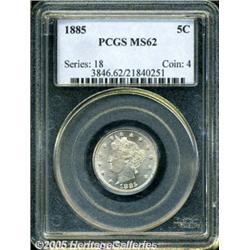<B>1885 5C MS62 PCGS.</B></I> Sharply struck, except for the star centers in the lower left obverse quadrant. Pleasing bright surfaces display touches of milky-gray color.