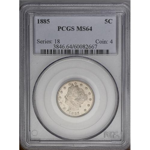 <B>1885<5C> MS64 PCGS.</B></I> Light chestnut and dove-gray streaks gently cross this fully lustrous and nearly unmarked near-Gem. Only the first three stars are not sharply struck. The low mintage key to the business strikes. <BR><BR><B>Important notice:</B> Heritage usually auctions material at the rate of 200-250 lots per hour. On some occasions eBay Live bid software or the Internet may not be able to keep up with the pace of the auction. We recommend placing a realistic absentee bid now as insurance to avoid disappointment. Occasionally the auctioneer may eliminate or reject an eBay Live bid, and the auctioneer may also reopen a lot after the close of the eBay live bidding (usually because we missed an audience bid), and may reject your bid even if it shows you as the winning bidder. By bidding via eBay Live, you agree that Heritage may award the lot to another bidder at its sole discretion under the circumstances described above or any other reasonable circumstances. Since eBay bids are not shown to us until we open the lot on the floor, we treat those bids just like floor bids. In most cases the floor responds before the eBay bid is presented to us, due to Internet lag time, so for consistency we have made it a policy that floor bids are always considered first over tie eBay live bids. Also please note that all Heritage lots purchased through eBay Live carry a 20% Buyer's Premium. Please make sure you read the Terms and Conditions before you bid. This lot is being auctioned in conjunction with a live floor auction by Heritage Galleries & Auctioneers. All final auction and invoice information will be supplied by Heritage Galleries & Auctioneers, and all other information should be considered preliminary. Lot:913 <BR><BR><B>Winning Notification and Billing:</B> After the FINAL session in this auction is complete, Heritage will send e-mail and snail mail invoices. This process normally takes several days. All final auction and invoice information will be supplied by Heritage Galleries & Auctioneers, and all other information should be considered preliminary. <BR><BR>This auction will be conducted on a live auction floor and over the Internet through eBay Live. If you choose to place an absentee bid, please take a moment to <font color='#0000ff'><u><a href='http://pages.ebay.com/liveauctions/help/before/laabsentee.html'>learn how eBay Live absentee bidding works</a></u></font><font color='#000000'>