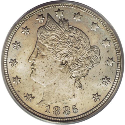 <B>1885 5C MS64 PCGS.</B></I> This highly lustrous near-Gem is unmarked for the grade, and has attractive almond-gold and powder-blue patina. Stars 7 to 10 are softly impressed, and a few carbon flecks are distributed. The 1885 has the lowest mintage of the series, unless the unofficial 1913 is included.<BR><BR><b>Shipping:</b> Coins & Currency (<a target="_blank" href="http://www.heritageauctions.com/common/shipping.php">view shipping information</a>)