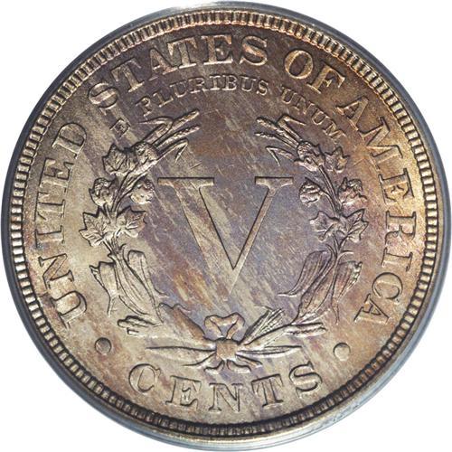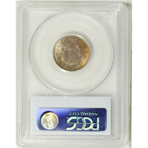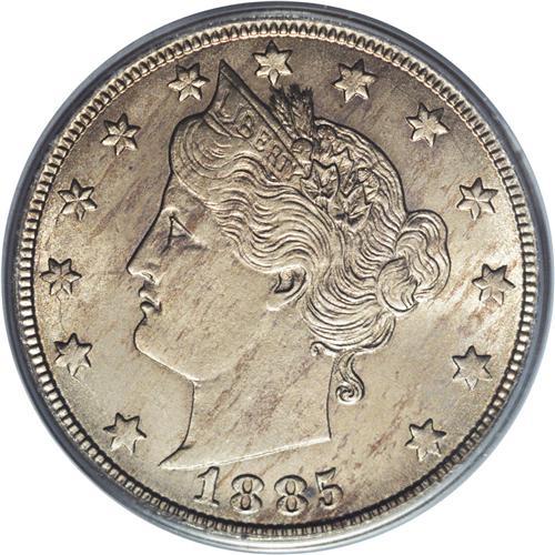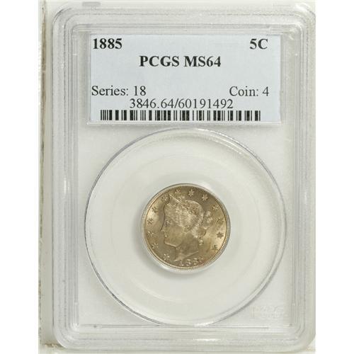 <B>1885 5C MS64 PCGS.</B></I> Unlike so many, this frosty near-Gem is easily classified as a rare business strike. It is sharply struck with brilliant gray-gold color on the obverse and vibrant iridescence on the reverse. The lower left part of the wreath is a little weak as always. Population: 69 in 64, 45 finer (10/06).<BR><I>From The Park Cities Collection.</B></I><BR><BR><b>Shipping:</b> Coin/Currency (<a target="_blank" href="http://www.heritageauctions.com/common/shipping.php">view shipping information</a>)