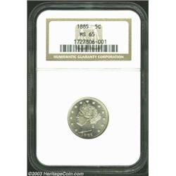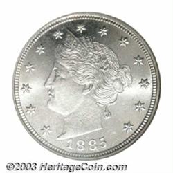 <TABLE cellSpacing=0 cellPadding=0 width="100%" bgColor=#000000 border=0><TBODY><TR><TD width="100%"><TABLE cellSpacing=1 cellPadding=3 width="100%" border=0><TBODY><TR><TD width="100%" bgColor=#79735c><FONT face=arial color=#ffffff size=3><B>Description</B> </FONT></TD></TR><TR><TD width="100%" bgColor=#ffffff><FONT face=arial size=2><B>1885 5C MS65 NGC.</B></I> Minted in small quantities, yet overlooked at the time of delivery, the 1885 nickel apparently saw extensive circulation at the end of the 19th century. The key among P-mint Liberty nickels, this is a flashy, silver-gray Gem. The central features are well defined and both sides display a pleasing cartwheel sheen. A significant find for the high quality specialist. Population: 17 in 65, 13 finer (7/03). </FONT></TD></TR></TBODY></TABLE></TD></TR></TBODY></TABLE><BR><A name=PricesRealized></A><TABLE cellSpacing=0 cellPadding=0 width="100%" bgColor=#000000 border=0><TBODY><TR><TD width="100%"><TABLE cellSpacing=1 cellPadding=3 width="100%" border=0><TBODY><TR><TD width="100%" bgColor=#79735c><A name=PR><FONT face=arial color=#ffffff size=3><B>Previous Prices from Heritage Auctions</B> </FONT></A></TD></TR><TR><TD bgColor=#f6f6ed><TABLE cellSpacing=0 cellPadding=0 width="100%" border=1><TBODY><TR><TD align=middle width="33%"><B>Date</B></TD><TD align=middle width="33%"><B>Service</B></TD><TD align=middle width="33%"><B>Price</B></TD></TR><TR bgColor=whitesmoke><TD width="33%"><B>02/18/2002</B></TD><TD width="33%">PCGS</TD><TD width="33%">$3,565.00</TD></TR><TR bgColor=whitesmoke><TD width="33%"><B>06/01/1996</B></TD><TD width="33%">PCGS</TD><TD width="33%">$1,540.00</TD></TR><TR bgColor=whitesmoke><TD width="33%"><B>01/01/1995</B></TD><TD width="33%">PCGS</TD><TD width="33%">$2,200.00</TD></TR><TR bgColor=whitesmoke><TD width="33%"><B>10/06/2000</B></TD><TD width="33%">NGC</TD><TD width="33%">$2,645.00</TD></TR><TR bgColor=whitesmoke><TD width="33%"><B>03/21/1998</B></TD><TD width="33%">NGC</TD><TD width="33%">$2,185.00</TD></TR></TBODY></TABLE></TD></TR><TR><TD bgColor=#ffffff><FONT face=arial size=1 ?>PLEASE NOTE: All prices realized reflect the final hammer price PLUS the buyer's premium in auctions that charge a buyer's premium. Each item has a notation at the top of the listing indicating whether that lot included a buyer's premium. Example: A item that sells with a final hammer price of $100 and a 20% buyer's premium will display with a price realized of $120. All information listed is intended to be as accurate as possible, but errors are possible. Please use this guide carefully and inform us of any inaccuracies. </FONT></TD></TR></TBODY></TABLE></TD></TR></TBODY></TABLE><BR><TABLE cellSpacing=0 cellPadding=0 width="100%" bgColor=#000000 border=0><TBODY><TR><TD width="100%"><TABLE cellSpacing=1 cellPadding=3 width="100%" border=0><TBODY><TR><TD width="100%" bgColor=#79735c colSpan=6><FONT face=arial color=#ffffff size=3><B>Price Guide*</B> </FONT></TD></TR><TR bgColor=#f6f6ed><TD align=middle><B>Grade</B> </TD><TD align=middle><B>Coin World<BR>(Trends)</B> </TD><TD align=middle><B>Numismedia<BR>Retail</B> </TD><TD align=middle><B>Numismedia<BR>Wholesale</B> </TD><TD align=middle><B>Coin<BR>Universe</B> </TD><TD align=middle><B>Heritage<BR>Value Index</B> </TD></TR><TR bgColor=#ffffff><TD align=middle>64</TD><TD align=right>$2,000.00</TD><TD align=right>---</TD><TD align=right>$1,225.00</TD><TD align=right>$2,250.00</TD><TD align=right>$1,426.67</TD></TR><TR style="FONT-WEIGHT: bold" bgColor=#cccfdd><TD align=middle>65</TD><TD align=right>$4,500.00</TD><TD align=right>---</TD><TD align=right>$2,375.00</TD><TD align=right>$4,750.00</TD><TD align=right>$3,148.33</TD></TR><TR bgColor=#ffffff><TD align=middle>66</TD><TD align=right>$6,500.00</TD><TD align=right>---</TD><TD align=right>$3,225.00</TD><TD align=right>$10,500.00</TD><TD align=right>$5,950.00</TD></TR><TR bgColor=#ffffff><TD colSpan=6><FONT size=1>*All information listed is intended to be as accurate as possible, but errors are possible. No item may be returned or refused based on this information which is provided as a service to our customers. You should contact each pricing source directly to determine the accuracy of this information. </FONT></TD></TR></TBODY></TABLE></TD></TR></TBODY></TABLE><BR><TABLE cellSpacing=0 cellPadding=0 width="100%" bgColor=#000000 border=0><TBODY><TR><TD width="100%"><TABLE cellSpacing=1 cellPadding=3 width="100%" border=0><TBODY><TR><TD width="100%" bgColor=#79735c><FONT face=arial color=#ffffff size=3><B>Population Guide</B> </FONT></TD></TR><TR bgColor=#ffffff><TD align=middle><!-- Begin Output of Population Grid--><TABLE cellSpacing=0 cellPadding=0 width="100%" border=0><TBODY><TR><TD vAlign=center><TABLE cellSpacing=0 width="100%" border=1 cellsadding="3"><TBODY><TR><TD vAlign=center><TABLE cellSpacing=0 cellPadding=3 width="100%" border=1><TBODY><TR><TD vAlign=center align=middle bgColor=#f0f1e8 colSpan=2 <CENTER><FONT face=Arial size=2><B>PCGS Pop </B></FONT><CENTER></CENTER></TD><TD vAlign=center align=middle bgColor=#f0f1e8 colSpan=2><CENTER><FONT face=Arial size=2><B>NGC Pop</B></CENTER></FONT></TD></TR><TR><TD vAlign=center><FONT face=Arial size=2>(65)</FONT> </TD><TD vAlign=center align=right><FONT face=Arial size=2>25</FONT> </TD><TD vAlign=center><FONT face=Arial size=2>(65)</FONT> </TD><TD vAlign=center align=right><FONT face=Arial size=2>17</FONT> </TD></TR><TR><TD vAlign=center><FONT face=Arial size=2>(>65)</FONT> </TD><TD vAlign=center align=right><FONT face=Arial size=2>11</FONT> </TD><TD vAlign=center><FONT face=Arial size=2>(>65)</FONT> </TD><TD vAlign=center align=right><FONT face=Arial size=2>13</FONT> </TD></TR></TBODY></TABLE></TD></TR></TBODY></TABLE></TD></TR></TBODY></TABLE><!-- End Output of Population Grid--> Important notice: Heritage usually auctions material at the rate of 200-250 lots per hour. On some occasions eBay Live bid software or the Internet may not be able to keep up with the pace of the auct