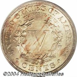 <table><tr><td><table><tr><td>1885 5C MS65 PCGS. A razor sharp example of this prized Liberty nickel issue and a coin that appears only a fraction as often as a proof of the same date. This piece leaves no doubt about its business strike origins, showing no trace of reflectiveness in the fields. The luster is excellent and the surfaces are modestly toned in a somewhat streaky, reddish-golden fashion. Population: 26 in 65, 13 finer (2/04). <BR><BR><B>Important notice:</B> Heritage usually auctions material at the rate of 200-250 lots per hour. On some occasions eBay Live bid software or the Internet may not be able to keep up with the pace of the auction. We recommend placing a realistic absentee bid now as insurance to avoid disappointment. Occasionally the auctioneer may eliminate or reject an eBay Live bid, and the auctioneer may also reopen a lot after the close of the eBay live bidding (usually because we missed an audience bid), and may reject your bid even if it shows you as the winning bidder. By bidding via eBay Live, you agree that Heritage may award the lot to another bidder at its sole discretion under the circumstances described above or any other reasonable circumstances. Since eBay bids are not shown to us until we open the lot on the floor, we treat those bids just like floor bids. In most cases the floor responds before the eBay bid is presented to us, due to Internet lag time, so for consistency we have made it a policy that floor bids are always considered first over tie eBay live bids. Also please note that all Heritage lots purchased through eBay Live carry a 20% Buyer's Premium. Please make sure you read the Terms and Conditions before you bid. <BR><BR><B>IMPORTANT ANNOUNCEMENT ABOUT RESERVES:</B> Heritage now divulges all reserves on its web site 7 days before every auction. If you want to know whether the reserve on this lot has been met, and if not, what the reserve amount is, please visit this lot page on the HeritageCoin.com web site, or email: bid@HeritageGalleries.com </span></font></td></tr></table></td></tr></table>