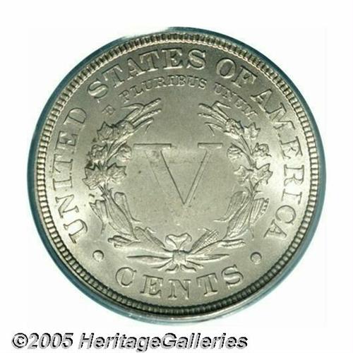 <B>1885<5C> MS65 PCGS.</B></I> Minted in small quantities, yet overlooked at the time of production, the 1885 Nickel apparently saw extensive circulation at the end of the 19th century. The key among P-mint Liberty Nickels, this is a flashy, dove-gray Gem. The central features are well defined and both sides display a pleasing cartwheel sheen. A significant find for the high quality specialist. Population: 28 in 65, 15 finer (4/05).