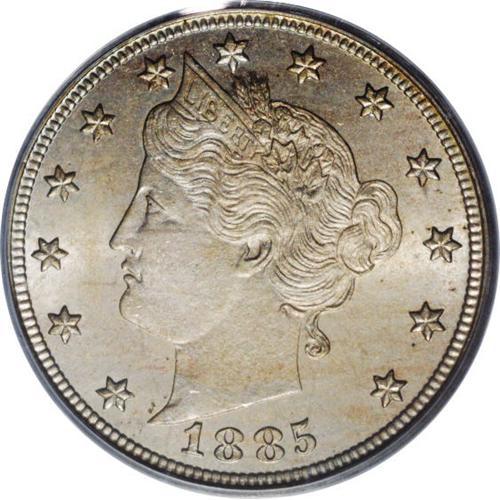 <B>1885<5C> MS65 PCGS.</B></I> This is the key date to the series and a coin that is difficult to find in Gem grades. The present coin has a sharp strike, particularly on the wreath. Even the obverse stars are crisp and complete. Delicate gold resides on the obverse and reverse, although hints of the familiar nickel-blue are found near the rims. Housed in a green insert PCGS holder. Close examination will discover a couple of minor carbon flecks on the obverse.<BR> This date is scarce because the Philadelphia Mint focused on other coinage during 1885-1886, and demand for the three cent nickel and Liberty nickel was apparently not high during this brief period. A few rolls or small hoards are all that survived in Uncirculated, leaving precious few for date collectors today. The present coin is certain to be the highlight of an advanced collection. <BR><BR><B>Important notice:</B> Heritage usually auctions material at the rate of 200-250 lots per hour. On some occasions eBay Live bid software or the Internet may not be able to keep up with the pace of the auction. We recommend placing a realistic absentee bid now as insurance to avoid disappointment. Occasionally the auctioneer may eliminate or reject an eBay Live bid, and the auctioneer may also reopen a lot after the close of the eBay live bidding (usually because we missed an audience bid), and may reject your bid even if it shows you as the winning bidder. By bidding via eBay Live, you agree that Heritage may award the lot to another bidder at its sole discretion under the circumstances described above or any other reasonable circumstances. Since eBay bids are not shown to us until we open the lot on the floor, we treat those bids just like floor bids. In most cases the floor responds before the eBay bid is presented to us, due to Internet lag time, so for consistency we have made it a policy that floor bids are always considered first over tie eBay live bids. Also please note that all Heritage lots purchased through eBay Live carry a 20% Buyer's Premium. Please make sure you read the Terms and Conditions before you bid. This lot is being auctioned in conjunction with a live floor auction by Heritage Galleries & Auctioneers. All final auction and invoice information will be supplied by Heritage Galleries & Auctioneers, and all other information should be considered preliminary. Lot:914 <BR><BR><B>Winning Notification and Billing:</B> After the FINAL session in this auction is complete, Heritage will send e-mail and snail mail invoices. This process normally takes several days. All final auction and invoice information will be supplied by Heritage Galleries & Auctioneers, and all other information should be considered preliminary. <BR><BR>This auction will be conducted on a live auction floor and over the Internet through eBay Live. If you choose to place an absentee bid, please take a moment to <font color='#0000ff'><u><a href='http://pages.ebay.com/liveauctions/help/before/laabsentee.html'>learn how eBay Live absentee bidding works</a></u></font><font color='#000000'>