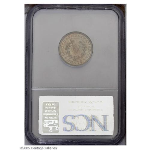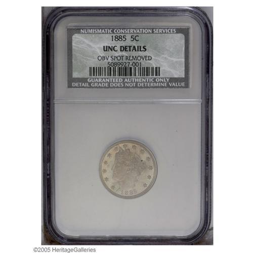 <B>1885<5C>--Obverse Spot Removed--NCS. Unc. Details.</B></I> Some smoothing of the obverse is detected between the first star and Liberty's bust tip. A small spot above the hair bun has not been altered. This well struck and shimmering piece has rich silver-gray, golden-brown, and olive colors. The low mintage key to the series.