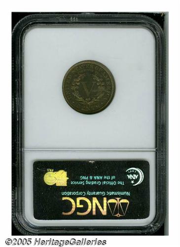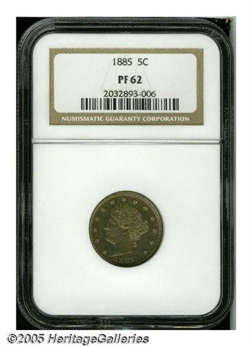 <B>1885<5C> PR62 NGC.</B></I> This is a key-date issue among Liberty nickels, with business strikes being quite rare. Proof examples, while more plentiful (3,790 pieces), are hardly common. This piece possesses a veneer of champagne-gold color and well struck devices. A few small flecks are noted, especially along the lower obverse border.