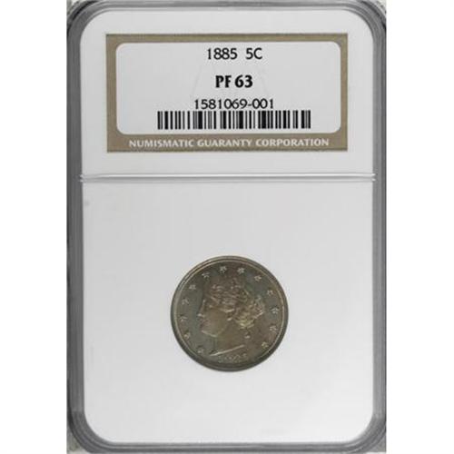 <B>1885 5C PR63 NGC.</B></I> A green-gold Select specimen of the most popular proof Liberty nickel issue, solidly struck with pleasing patina. Small dots of deeper color and light hairlines are present to the right of the portrait.<BR><BR><B>Coin Engraver:</B> Charles E. Barber<BR><BR><b>Shipping:</b> Coins & Currency (<a target="_blank" href="http://www.heritageauctions.com/common/shipping.php">view shipping information</a>)