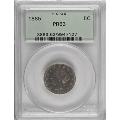 <B>1885 5C PR63 PCGS.</B></I> This crisply struck key date nickel is attractively patinated in orange and steel-gray. Remarkably smooth for the Select level. Housed in an old green label holder.<BR><BR><B>Coin Engraver:</B> Charles E. Barber<BR><BR><b>Shipping:</b> Coins & Currency (<a target="_blank" href="http://www.heritageauctions.com/common/shipping.php">view shipping information</a>)