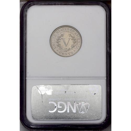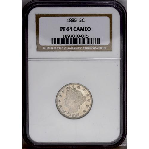 <B>1885<5C> PR64 Cameo NGC.</B></I> Luminous sky-blue and apricot fields mildly contrast with delicately frosted devices. Sharply struck, and only a solitary carbon fleck beneath the left edge of the denominational V is worthy of comment. As a date, the lowest mintage in the series, excluding the non-collectible 1913.