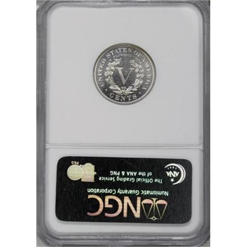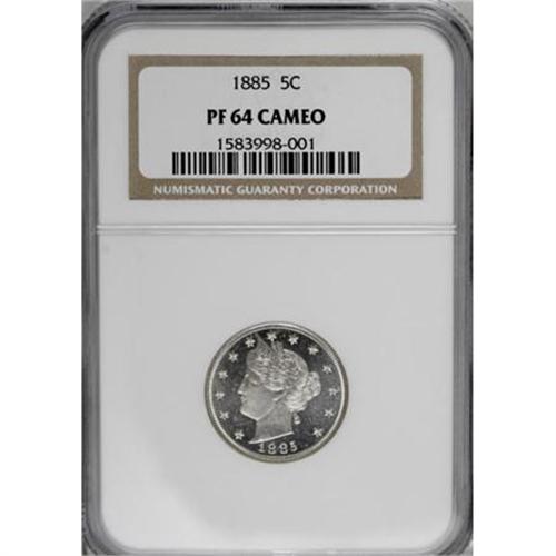 <B>1885 5C PR64 Cameo NGC.</B></I> Excellent contrast is evident on both sides of this Choice Cameo proof. The surfaces are fully brilliant medium gray, with lighter gray devices. The 1885 is a key date in business strike, and proofs are always in demand as well.<BR><BR><b>Shipping:</b> Coins & Currency (<a target="_blank" href="http://www.heritageauctions.com/common/shipping.php">view shipping information</a>)