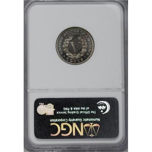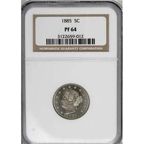 <B>1885 5C PR64 NGC.</B></I> An uncommonly flashy Choice example of this popular proof issue, sharply struck with excellent mirrors beneath soft gold and peach toning. A few small flyspecks appear to the left of the portrait.<BR><I>From The John Stimson, Sr. Collection, Part Two.</B></I><BR><BR><B>Coin Engraver:</B> Charles E. Barber<BR><BR><b>Shipping:</b> Coins & Currency (<a target="_blank" href="http://www.heritageauctions.com/common/shipping.php">view shipping information</a>)