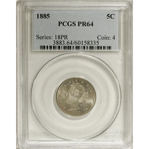 1885 5C PR64 PCGS. Dusky tan and ice-blue toning adorn