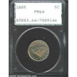 <TR><TD width="100%"><TABLE cellSpacing=1 cellPadding=3 width="100%" border=0><TBODY><TR><TD width="100%" bgColor=#79735c><FONT face=arial color=#ffffff size=3><B>Description</B> </FONT></TD></TR><TR><TD width="100%" bgColor=#ffffff><FONT face=arial size=2><B>1885 5C PR64 PCGS.</B></I> Powder-blue and apricot streaks embrace this attractively preserved near-Gem. Well struck except for the left ear of corn, which nonetheless has better definition than often encountered. The key date to the series, if the legendary 1913 rarity is excluded. </FONT></TD></TR></TBODY></TABLE></TD></TR></TBODY></TABLE><BR><A name=PricesRealized></A><TABLE cellSpacing=0 cellPadding=0 width="100%" bgColor=#000000 border=0><TBODY><TR><TD width="100%"><TABLE cellSpacing=1 cellPadding=3 width="100%" border=0><TBODY><TR><TD width="100%" bgColor=#79735c><A name=PR><FONT face=arial color=#ffffff size=3><B>Previous Prices from Heritage Auctions</B> </FONT></A></TD></TR><TR><TD bgColor=#f6f6ed><TABLE cellSpacing=0 cellPadding=0 width="100%" border=1><TBODY><TR><TD align=middle width="33%"><B>Date</B></TD><TD align=middle width="33%"><B>Service</B></TD><TD align=middle width="33%"><B>Price</B></TD></TR><TR bgColor=whitesmoke><TD width="33%"><B>07/31/1993</B></TD><TD width="33%">PCGS</TD><TD width="33%">$687.50</TD></TR><TR bgColor=whitesmoke><TD width="33%"><B>02/06/1995</B></TD><TD width="33%">PCGS</TD><TD width="33%">$577.50</TD></TR><TR bgColor=whitesmoke><TD width="33%"><B>09/01/1998</B></TD><TD width="33%">PCGS</TD><TD width="33%">$673.00</TD></TR><TR bgColor=whitesmoke><TD width="33%"><B>09/01/1995</B></TD><TD width="33%">PCGS</TD><TD width="33%">$770.00</TD></TR><TR bgColor=whitesmoke><TD width="33%"><B>03/01/1999</B></TD><TD width="33%">PCGS</TD><TD width="33%">$690.00</TD></TR><TR bgColor=whitesmoke><TD width="33%"><B>02/01/1998</B></TD><TD width="33%">NGC</TD><TD width="33%">$660.00</TD></TR><TR bgColor=whitesmoke><TD width="33%"><B>07/03/2001</B></TD><TD width="33%">PCGS</TD><TD width="33%">$625.00</TD></TR><TR bgColor=whitesmoke><TD width="33%"><B>04/28/2002</B></TD><TD width="33%">NGC</TD><TD width="33%">$805.00</TD></TR><TR bgColor=whitesmoke><TD width="33%"><B>05/31/2003</B></TD><TD width="33%">NGC</TD><TD width="33%">$661.25</TD></TR></TBODY></TABLE></TD></TR><TR><TD bgColor=#ffffff><FONT face=arial size=1 ?>PLEASE NOTE: All prices realized reflect the final hammer price PLUS the buyer's premium in auctions that charge a buyer's premium. Each item has a notation at the top of the listing indicating whether that lot included a buyer's premium. Example: A item that sells with a final hammer price of $100 and a 20% buyer's premium will display with a price realized of $120. All information listed is intended to be as accurate as possible, but errors are possible. Please use this guide carefully and inform us of any inaccuracies. </FONT></TD></TR></TBODY></TABLE></TD></TR></TBODY></TABLE><BR><TABLE cellSpacing=0 cellPadding=0 width="100%" bgColor=#000000 border=0><TBODY><TR><TD width="100%"><TABLE cellSpacing=1 cellPadding=3 width="100%" border=0><TBODY><TR><TD width="100%" bgColor=#79735c colSpan=6><FONT face=arial color=#ffffff size=3><B>Price Guide*</B> </FONT></TD></TR><TR bgColor=#f6f6ed><TD align=middle><B>Grade</B> </TD><TD align=middle><B>Coin World<BR>(Trends)</B> </TD><TD align=middle><B>Numismedia<BR>Retail</B> </TD><TD align=middle><B>Numismedia<BR>Wholesale</B> </TD><TD align=middle><B>Coin<BR>Universe</B> </TD><TD align=middle><B>Heritage<BR>Value Index</B> </TD></TR><TR bgColor=#ffffff><TD align=middle>63</TD><TD align=right>---</TD><TD align=right>$710.00</TD><TD align=right>$565.00</TD><TD align=right>$780.00</TD><TD align=right>$525.00</TD></TR><TR style="FONT-WEIGHT: bold" bgColor=#cccfdd><TD align=middle>64</TD><TD align=right>---</TD><TD align=right>$790.00</TD><TD align=right>$635.00</TD><TD align=right>$845.00</TD><TD align=right>$600.50</TD></TR><TR bgColor=#ffffff><TD align=middle>65</TD><TD align=right>---</TD><TD align=right>---</TD><TD align=right>$845.00</TD><TD align=right>$975.00</TD><TD align=right>$718.75</TD></TR><TR bgColor=#ffffff><TD colSpan=6><FONT size=1>*All information listed is intended to be as accurate as possible, but errors are possible. No item may be returned or refused based on this information which is provided as a service to our customers. You should contact each pricing source directly to determine the accuracy of this information. </FONT></TD></TR></TBODY></TABLE></TD></TR></TBODY></TABLE><BR><TABLE cellSpacing=0 cellPadding=0 width="100%" bgColor=#000000 border=0><TBODY><TR><TD width="100%"><TABLE cellSpacing=1 cellPadding=3 width="100%" border=0><TBODY><TR><TD width="100%" bgColor=#79735c><FONT face=arial color=#ffffff size=3><B>Population Guide</B> </FONT></TD></TR><TR bgColor=#ffffff><TD align=middle><!-- Begin Output of Population Grid--><TABLE cellSpacing=0 cellPadding=0 width="100%" border=0><TBODY><TR><TD vAlign=center><TABLE cellSpacing=0 width="100%" border=1 cellsadding="3"><TBODY><TR><TD vAlign=center><TABLE cellSpacing=0 cellPadding=3 width="100%" border=1><TBODY><TR><TD vAlign=center align=middle bgColor=#f0f1e8 colSpan=2 <CENTER><FONT face=Arial size=2><B>PCGS Pop </B></FONT><CENTER></CENTER></TD><TD vAlign=center align=middle bgColor=#f0f1e8 colSpan=2><CENTER><FONT face=Arial size=2><B>NGC Pop</B></CENTER></FONT></TD></TR><TR><TD vAlign=center><FONT face=Arial size=2>(64)</FONT> </TD><TD vAlign=center align=right><FONT face=Arial size=2>264</FONT> </TD><TD vAlign=center><FONT face=Arial size=2>(64)</FONT> </TD><TD vAlign=center align=right><FONT face=Arial size=2>146</FONT> </TD></TR><TR><TD vAlign=center><FONT face=Arial size=2>(>64)</FONT> </TD><TD vAlign=center align=right><FONT face=Arial size=2>328</FONT> </TD><TD vAlign=center><FONT face=Arial size=2>(>64)</FONT> </TD><TD vAlign=center align=right><FONT face=Arial size=2>314</FONT> </TD></TR></TBODY></TABLE></TD></TR></TBODY></TABLE></TD></TR></TBODY></TABLE><!-- End Output of Populat