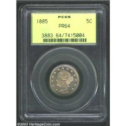 <TABLE cellSpacing=0 cellPadding=0 width="100%" bgColor=#000000 border=0><TBODY><TR><TD width="100%"><TABLE cellSpacing=1 cellPadding=3 width="100%" border=0><TBODY><TR><TD width="100%" bgColor=#79735c><FONT face=arial color=#ffffff size=3><B>Description</B> </FONT></TD></TR><TR><TD width="100%" bgColor=#ffffff><FONT face=arial size=2><B>1885 5C PR64 PCGS.</B></I> A key Liberty nickel proof issue in an excellent state of preservation. The lightly toned surfaces are a pale lilac-gray in the fields, with olive-gold color on the devices, and russet mottling over the reverse center. </FONT></TD></TR></TBODY></TABLE></TD></TR></TBODY></TABLE><BR><A name=PricesRealized></A><TABLE cellSpacing=0 cellPadding=0 width="100%" bgColor=#000000 border=0><TBODY><TR><TD width="100%"><TABLE cellSpacing=1 cellPadding=3 width="100%" border=0><TBODY><TR><TD width="100%" bgColor=#79735c><A name=PR><FONT face=arial color=#ffffff size=3><B>Previous Prices from Heritage Auctions</B> </FONT></A></TD></TR><TR><TD bgColor=#f6f6ed><TABLE cellSpacing=0 cellPadding=0 width="100%" border=1><TBODY><TR><TD align=middle width="33%"><B>Date</B></TD><TD align=middle width="33%"><B>Service</B></TD><TD align=middle width="33%"><B>Price</B></TD></TR><TR bgColor=whitesmoke><TD width="33%"><B>10/01/2002</B></TD><TD width="33%">PCGS</TD><TD width="33%">$661.25</TD></TR><TR bgColor=whitesmoke><TD width="33%"><B>07/03/2001</B></TD><TD width="33%">PCGS</TD><TD width="33%">$625.00</TD></TR><TR bgColor=whitesmoke><TD width="33%"><B>06/03/1994</B></TD><TD width="33%">PCGS</TD><TD width="33%">$632.50</TD></TR><TR bgColor=whitesmoke><TD width="33%"><B>04/28/2002</B></TD><TD width="33%">NGC</TD><TD width="33%">$805.00</TD></TR><TR bgColor=whitesmoke><TD width="33%"><B>11/15/2001</B></TD><TD width="33%">ANACS</TD><TD width="33%">$730.25</TD></TR><TR bgColor=whitesmoke><TD width="33%"><B>07/29/2003</B></TD><TD width="33%">PCGS</TD><TD width="33%">$833.75</TD></TR><TR bgColor=whitesmoke><TD width="33%"><B>06/10/2000</B></TD><TD width="33%">PCGS</TD><TD width="33%">$632.50</TD></TR><TR bgColor=whitesmoke><TD width="33%"><B>07/31/1993</B></TD><TD width="33%">PCGS</TD><TD width="33%">$687.50</TD></TR><TR bgColor=whitesmoke><TD width="33%"><B>02/11/2000</B></TD><TD width="33%">PCGS</TD><TD width="33%">$661.25</TD></TR><TR bgColor=whitesmoke><TD width="33%"><B>02/06/1995</B></TD><TD width="33%">PCGS</TD><TD width="33%">$577.50</TD></TR><TR bgColor=whitesmoke><TD width="33%"><B>05/29/1996</B></TD><TD width="33%">PCGS</TD><TD width="33%">$583.00</TD></TR><TR bgColor=whitesmoke><TD width="33%"><B>09/01/1998</B></TD><TD width="33%">PCGS</TD><TD width="33%">$673.00</TD></TR><TR bgColor=whitesmoke><TD width="33%"><B>02/01/1999</B></TD><TD width="33%">PCGS</TD><TD width="33%">$644.00</TD></TR><TR bgColor=whitesmoke><TD width="33%"><B>09/01/1995</B></TD><TD width="33%">PCGS</TD><TD width="33%">$770.00</TD></TR><TR bgColor=whitesmoke><TD width="33%"><B>01/01/1996</B></TD><TD width="33%">PCGS</TD><TD width="33%">$660.00</TD></TR><TR bgColor=whitesmoke><TD width="33%"><B>03/01/1999</B></TD><TD width="33%">PCGS</TD><TD width="33%">$690.00</TD></TR><TR bgColor=whitesmoke><TD width="33%"><B>05/31/2003</B></TD><TD width="33%">NGC</TD><TD width="33%">$661.25</TD></TR><TR bgColor=whitesmoke><TD width="33%"><B>02/01/1999</B></TD><TD width="33%">NGC</TD><TD width="33%">$604.00</TD></TR><TR bgColor=whitesmoke><TD width="33%"><B>02/01/1998</B></TD><TD width="33%">NGC</TD><TD width="33%">$660.00</TD></TR></TBODY></TABLE></TD></TR><TR><TD bgColor=#ffffff><FONT face=arial size=1 ?>PLEASE NOTE: All prices realized reflect the final hammer price PLUS the buyer's premium in auctions that charge a buyer's premium. Each item has a notation at the top of the listing indicating whether that lot included a buyer's premium. Example: A item that sells with a final hammer price of $100 and a 20% buyer's premium will display with a price realized of $120. All information listed is intended to be as accurate as possible, but errors are possible. Please use this guide carefully and inform us of any inaccuracies. </FONT></TD></TR></TBODY></TABLE></TD></TR></TBODY></TABLE><BR><TABLE cellSpacing=0 cellPadding=0 width="100%" bgColor=#000000 border=0><TBODY><TR><TD width="100%"><TABLE cellSpacing=1 cellPadding=3 width="100%" border=0><TBODY><TR><TD width="100%" bgColor=#79735c colSpan=6><FONT face=arial color=#ffffff size=3><B>Price Guide*</B> </FONT></TD></TR><TR bgColor=#f6f6ed><TD align=middle><B>Grade</B> </TD><TD align=middle><B>Coin World<BR>(Trends)</B> </TD><TD align=middle><B>Numismedia<BR>Retail</B> </TD><TD align=middle><B>Numismedia<BR>Wholesale</B> </TD><TD align=middle><B>Coin<BR>Universe</B> </TD><TD align=middle><B>Heritage<BR>Value Index</B> </TD></TR><TR bgColor=#ffffff><TD align=middle>63</TD><TD align=right>---</TD><TD align=right>$710.00</TD><TD align=right>$565.00</TD><TD align=right>$780.00</TD><TD align=right>$525.00</TD></TR><TR style="FONT-WEIGHT: bold" bgColor=#cccfdd><TD align=middle>64</TD><TD align=right>---</TD><TD align=right>$790.00</TD><TD align=right>$635.00</TD><TD align=right>$845.00</TD><TD align=right>$600.50</TD></TR><TR bgColor=#ffffff><TD align=middle>65</TD><TD align=right>---</TD><TD align=right>---</TD><TD align=right>$845.00</TD><TD align=right>$975.00</TD><TD align=right>$718.75</TD></TR><TR bgColor=#ffffff><TD colSpan=6><FONT size=1>*All information listed is intended to be as accurate as possible, but errors are possible. No item may be returned or refused based on this information which is provided as a service to our customers. You should contact each pricing source directly to determine the accuracy of this information. </FONT></TD></TR></TBODY></TABLE></TD></TR></TBODY></TABLE><BR><TABLE cellSpacing=0 cellPadding=0 width="100%" bgColor=#000000 border=0><TBODY><TR><TD width="100%"><TABLE cellSpacing=1 cellPadding=3 width="100%" border=0><TBODY><TR><TD width="100%" bgColor=#79735c><FONT face=arial color=#ffffff size=3><B>Population Guide<