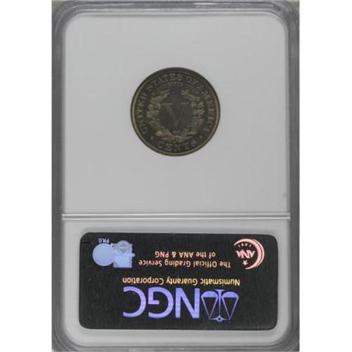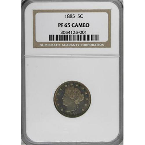 <B>1885 5C PR65 Cameo NGC.</B></I> This issue is highly popular with collectors because of the scarcity of the key date 1885 business strikes. This is a deeply reflective example that displays pleasing frost on the devices. Moderately toned throughout with no obvious or mentionable contact marks. Census: 23 in 65 Cameo, 37 finer (10/07). <BR><BR><b>Shipping:</b> Coins & Currency (<a target="_blank" href="http://www.heritageauctions.com/common/shipping.php">view shipping information</a>)