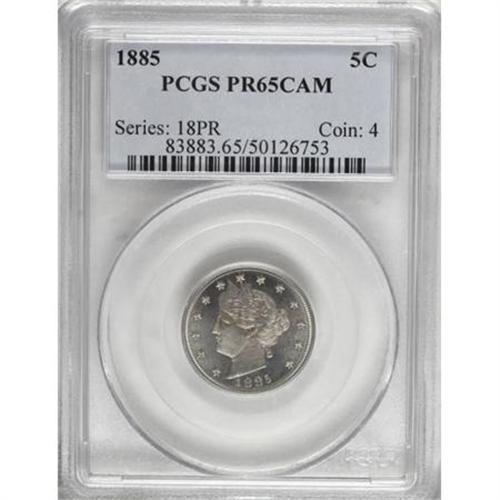 <B>1885 5C PR65 Cameo PCGS.</B></I> A crisply struck and immensely appealing example of this atypically popular proof Liberty nickel issue, carefully preserved with appreciable contrast. Pale sky-blue and rose-gold patina drapes each side. Population: 19 in 65 Cameo, 34 finer (8/07).<BR><BR><b>Shipping:</b> Coins & Currency (<a target="_blank" href="http://www.heritageauctions.com/common/shipping.php">view shipping information</a>)