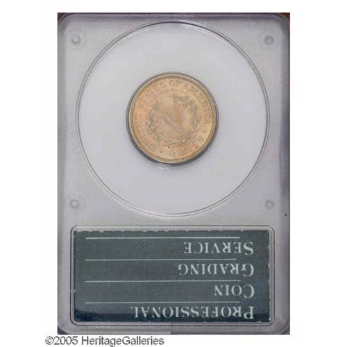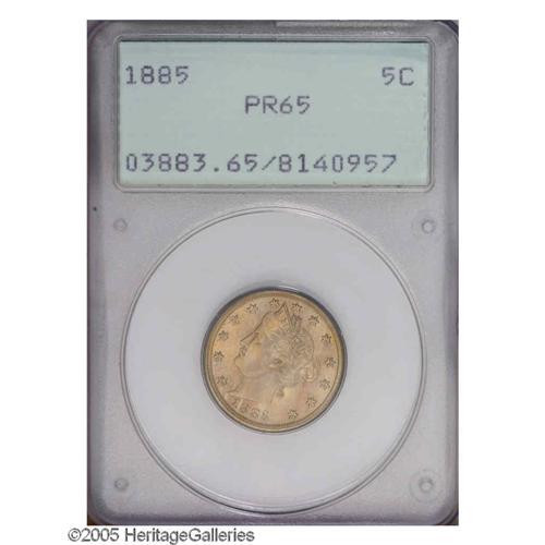 <B>1885<5C> PR65 PCGS.</B></I> Certified in a first generation holder, this nicely struck Gem is attractively toned in pastel pink and gold tints. An occasional minute carbon fleck does not distract. Since the 1885 is the key to the business strike Liberty Nickel series, its proof equivalent is always in demand as a quality substitute for a rare high grade Mint State example.