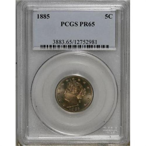 <B>1885 5C PR65 PCGS.</B></I> This is a beautiful specimen, with memorable champagne-gray and sky-blue toning. The devices are sharply struck, except for obverse star 2, the fields are nicely reflective, and the surfaces are well preserved on both sides. The 1885 business strike of this type is a scarce key date, and proof Gems are actually more available and less expensive. <BR><BR><B>Coin Engraver:</B> Charles E. Barber<BR><BR><b>Shipping:</b> Coins & Currency (<a target="_blank" href="http://www.heritageauctions.com/common/shipping.php">view shipping information</a>)