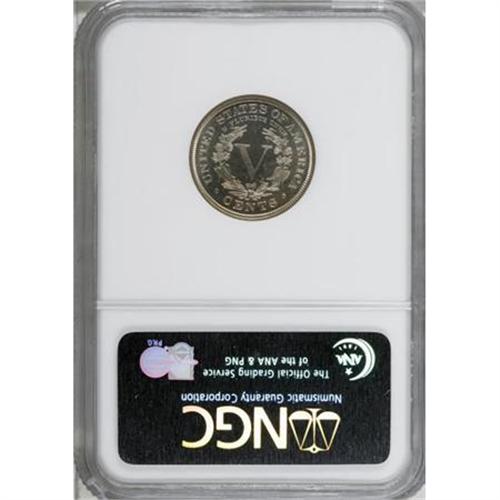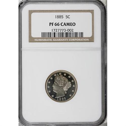 <B>1885 5C PR66 Cameo NGC.</B></I> A surprising and delightful Premium Gem example of this popular issue with strong contrast. Subtle golden shadings drape each side of this delightful coin. Census: 24 in 66 Cameo, 13 finer (3/08).<BR><BR><b>Shipping:</b> Coins & Currency (<a target="_blank" href="http://www.heritageauctions.com/common/shipping.php">view shipping information</a>)