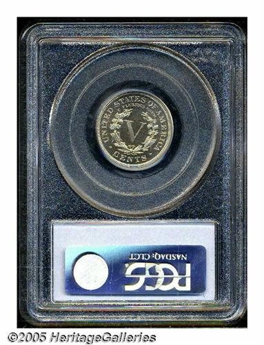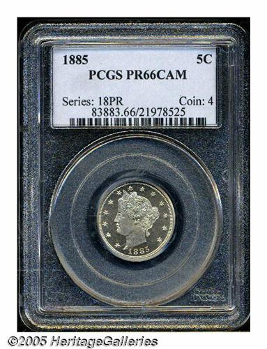 <B>1885<5C> PR66 Cameo PCGS.</B></I> Lovely Superb-Gem proof example with light golden wash over the surfaces, good contrast, and no notable problems.