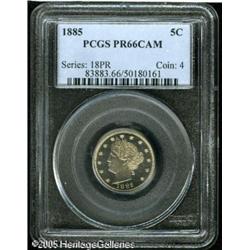<B>1885 5C PR66 Cameo PCGS.</B></I> Proof 1885 nickels have long been popular with collectors because of the absolute and condition scarcity of business strikes. This is a very deeply mirrored example that displays moderate mint frost over the devices. Lightly toned throughout with no obvious or mentionable contact marks. Population: 16 in 66, 5 finer (1/05). Lot:5912