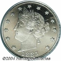 <table><tr><td><table><tr><td>1885 5C PR66 Deep Cameo PCGS. Light tan-gold patina endows this boldly struck and nearly pristine premium Gem. The cameo contrast is impressive, even on Liberty's cheek and neck which usually (but not on this coin) shows less contrast than the other design elements. Minor and fully retained laminations are noted near the tenth and twelfth stars. PCGS has only certified two proof 1885 Nickels as Deep Cameo, the other piece is two grades lower. A rare opportunity to obtain a Deep Cameo example of this famous key date. <BR><BR><B>Important notice:</B> Heritage usually auctions material at the rate of 200-250 lots per hour. On some occasions eBay Live bid software or the Internet may not be able to keep up with the pace of the auction. We recommend placing a realistic absentee bid now as insurance to avoid disappointment. Occasionally the auctioneer may eliminate or reject an eBay Live bid, and the auctioneer may also reopen a lot after the close of the eBay live bidding (usually because we missed an audience bid), and may reject your bid even if it shows you as the winning bidder. By bidding via eBay Live, you agree that Heritage may award the lot to another bidder at its sole discretion under the circumstances described above or any other reasonable circumstances. Since eBay bids are not shown to us until we open the lot on the floor, we treat those bids just like floor bids. In most cases the floor responds before the eBay bid is presented to us, due to Internet lag time, so for consistency we have made it a policy that floor bids are always considered first over tie eBay live bids. Also please note that all Heritage lots purchased through eBay Live carry a 20% Buyer's Premium. Please make sure you read the Terms and Conditions before you bid. <BR><BR><B>IMPORTANT ANNOUNCEMENT ABOUT RESERVES:</B> Heritage now divulges all reserves on its web site 7 days before every auction. If you want to know whether the reserve on this lot has been met, and if not, what the reserve amount is, please visit this lot page on the HeritageCoin.com web site, or email: bid@HeritageGalleries.com </span></font></td></tr></table></td></tr></table>