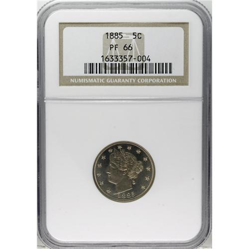 <B>1885 5C PR66 NGC.</B></I> Sunset-orange patina drapes this Premium Gem. While the mintage of 3,790 specimens is normal compared to nearby years, the elusive nature of business strikes from this year put additional pressure on the supply.<BR><BR><b>Shipping:</b> Coin/Currency (<a target="_blank" href="http://www.heritageauctions.com/common/shipping.php">view shipping information</a>)