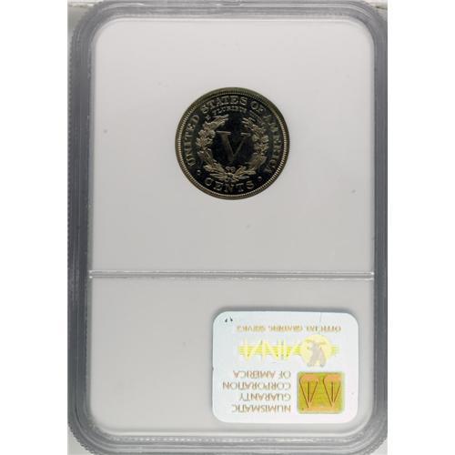 1885 5C PR66 NGC. Sunset-orange patina drapes this Pre