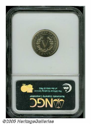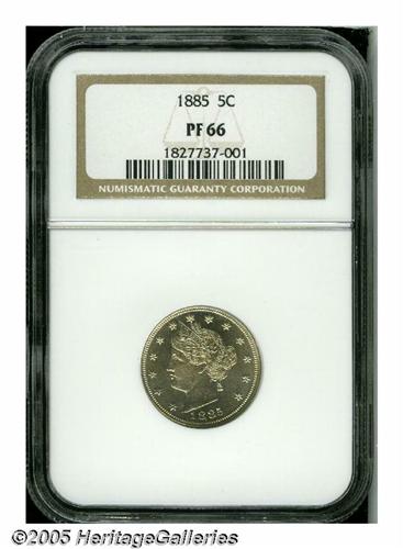 <B>1885<5C> PR66 NGC.</B></I> The traditional key date to the series of Liberty Nickels has long given added importance to proofs from the same year. This needle sharp, modestly reflective specimen actually resembles its scarcer business strike counterpart.