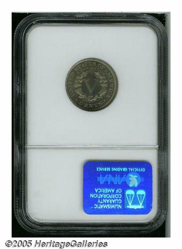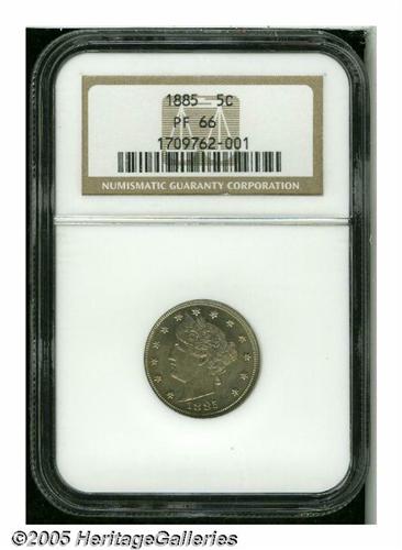 <B>1885<5C> PR66 NGC.</B></I> The traditional key date to the series of Liberty Nickels has long given added importance to proofs from the same year. This specimen features light tan and pale blue patina over bright proof surfaces. The design elements are adequately struck. Just a couple of minute marks are located in the lower obverse field.