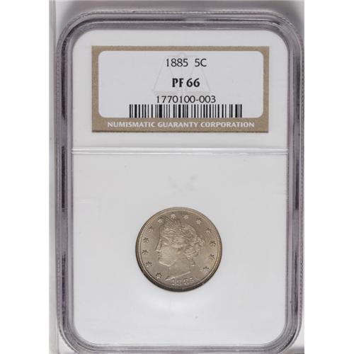 <B>1885<5C> PR66 NGC.</B></I> This shallowly mirrored proof would fit nicely in a Gem set of Liberty nickels. The strike is full, and each side has moderate blue-gray and rose toning. A technically superior example of this popular issue.