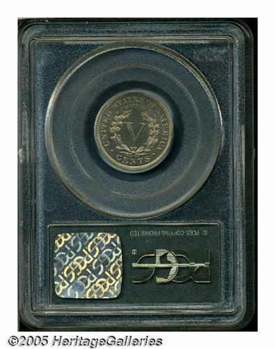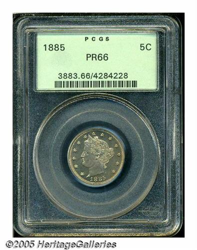 <B>1885<5C> PR66 PCGS.</B></I> The 1885 is considered the key proof date in the series although there was a comparatively high mintage of 3,790 pieces. The higher value of this issue is controlled by the rarity of the 1885 business strike. This coin exhibits nicely mirrored fields complemented with some natural golden-rose toning, and is a virtually pristine Premium Gem proof.