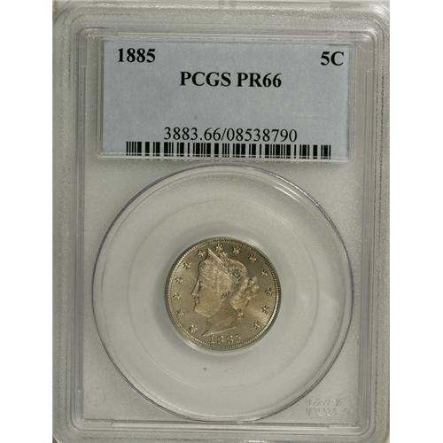 <B>1885 5C PR66 PCGS.</B></I> The key-date status of this issue's business strike influences the price of proofs as well. This moderately reflective rose-toned Premium Gem has some striation luster, which would let it blend in more easily with a collection of circulation examples.<BR><BR><b>Shipping:</b> Coin/Currency (<a target="_blank" href="http://www.heritageauctions.com/common/shipping.php">view shipping information</a>)