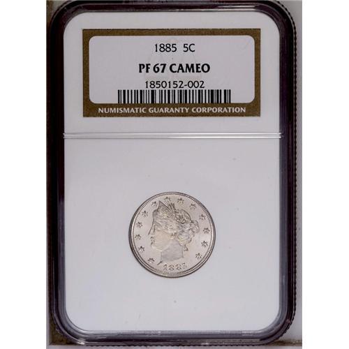 <B>1885<5C> PR67 Cameo NGC.</B></I> This is one of the most beautiful examples of this date that we have seen. Both sides have amazing contrast and sharp design elements. It is boldly struck and enhanced by the slightest trace of toning. Tied for the finest Cameo proof certified by either grading service. Census: 11 in 67 Cameo, 0 finer (3/06). <BR><BR><B>Important notice:</B> Heritage usually auctions material at the rate of 200-250 lots per hour. On some occasions eBay Live bid software or the Internet may not be able to keep up with the pace of the auction. We recommend placing a realistic absentee bid now as insurance to avoid disappointment. Occasionally the auctioneer may eliminate or reject an eBay Live bid, and the auctioneer may also reopen a lot after the close of the eBay live bidding (usually because we missed an audience bid), and may reject your bid even if it shows you as the winning bidder. By bidding via eBay Live, you agree that Heritage may award the lot to another bidder at its sole discretion under the circumstances described above or any other reasonable circumstances. Since eBay bids are not shown to us until we open the lot on the floor, we treat those bids just like floor bids. In most cases the floor responds before the eBay bid is presented to us, due to Internet lag time, so for consistency we have made it a policy that floor bids are always considered first over tie eBay live bids. Also please note that all Heritage lots purchased through eBay Live carry a 20% Buyer's Premium. Please make sure you read the Terms and Conditions before you bid. This lot is being auctioned in conjunction with a live floor auction by Heritage Galleries & Auctioneers. All final auction and invoice information will be supplied by Heritage Galleries & Auctioneers, and all other information should be considered preliminary. Lot:984 <BR><BR><B>Winning Notification and Billing:</B> After the FINAL session in this auction is complete, Heritage will send e-mail and snail mail invoices. This process normally takes several days. All final auction and invoice information will be supplied by Heritage Galleries & Auctioneers, and all other information should be considered preliminary. <BR><BR>This auction will be conducted on a live auction floor and over the Internet through eBay Live. If you choose to place an absentee bid, please take a moment to <font color='#0000ff'><u><a href='http://pages.ebay.com/liveauctions/help/before/laabsentee.html'>learn how eBay Live absentee bidding works</a></u></font><font color='#000000'>