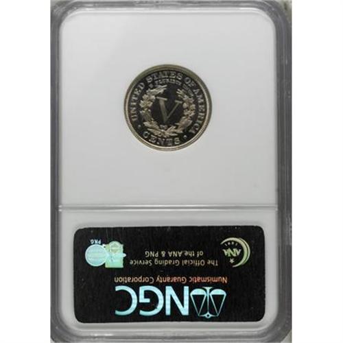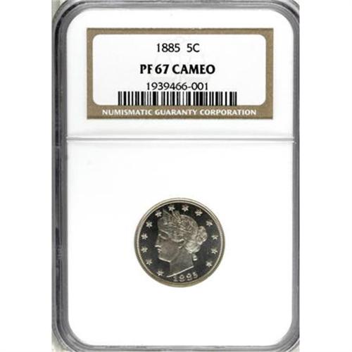 <B>1885 5C PR67 Cameo NGC.</B></I> Deeply mirrored with sharply contrasting design elements. The 1885 is an always-popular issue in proof format because of the well known scarcity of Uncirculated 1885 Nickels, the key date in the series. The reverse exhibits a tiny lamination near the base of the V that is only visible with magnification. Census: 13 in 67 Cameo, 0 finer (7/07).<BR><BR><b>Shipping:</b> Coins & Currency (<a target="_blank" href="http://www.heritageauctions.com/common/shipping.php">view shipping information</a>\)