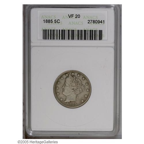 <B>1885<5C> VF20 ANACS.</B></I> This battleship-gray piece has a fully legible LIBERTY and noticeable hair and wreath detail. The low mintage 1885 is the key to the collectible (non-1913) portion of the Liberty Nickel series.<BR><I>From The New Zealand Collection.</B></I>