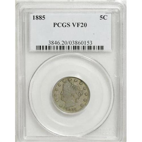 <B>1885 5C VF20 PCGS.</B></I> Many Liberty nickel collectors have searched in vain for an example of this issue, the most important key date in the series. This VF coin is suitably detailed for the grade, with greenish-gray surfaces that show scattered bits of dark verdigris but few abrasions. <BR><BR><B>Coin Engraver:</B> Charles E. Barber<BR><BR><b>Shipping:</b> Coins & Currency (<a target="_blank" href="http://www.heritageauctions.com/common/shipping.php">view shipping information</a>)