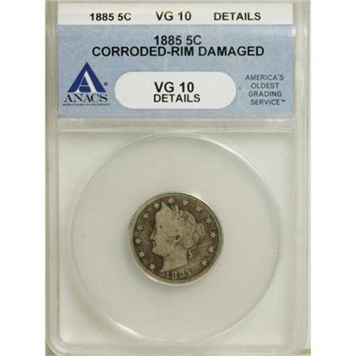 <B>1885 5C --Corroded, Rim Damaged--ANACS. VG10 Details.</B></I> NGC Census: (12/261). PCGS Population (21/448). Mintage: 1,476,490. Numismedia Wsl. Price for NGC/PCGS coin in VG10: $583. (#3846)<BR><BR><B>Coin Engraver:</B> Charles E. Barber<BR><BR><b>Shipping:</b> Coins & Currency (<a target="_blank" href="http://www.heritageauctions.com/common/shipping.php">view shipping information</a>)